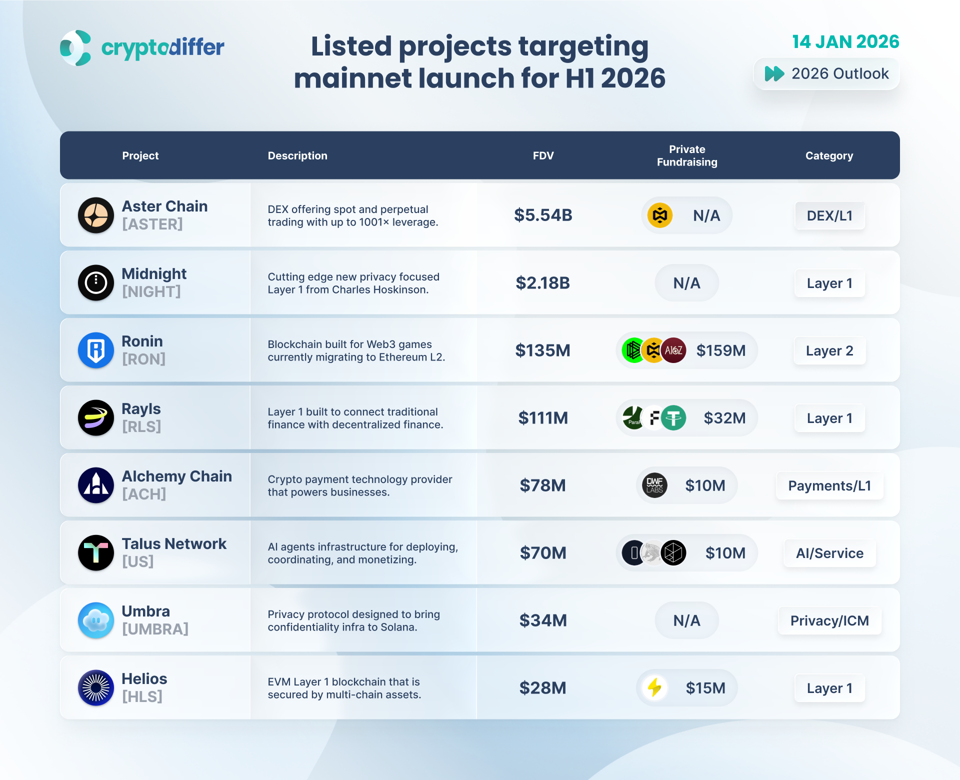 The first half of 2026 could bring several new mainnets built around privacy, payments, and on-chain AI services. Weβve mapped the key contenders with valuation and funding context to help you monitor whatβs actually close to shipping.