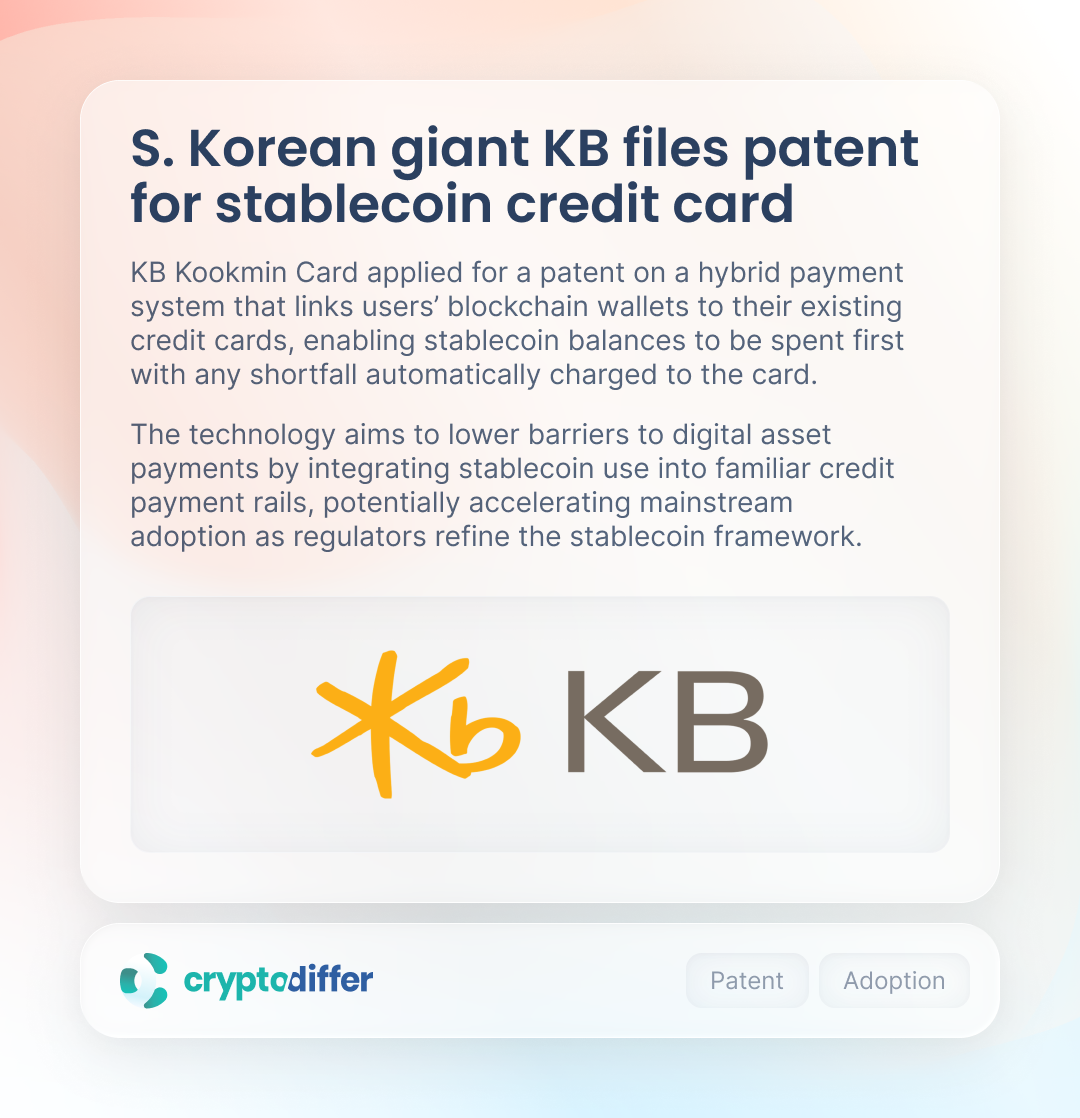 KB Kookmin Card applied for a patent on a hybrid payment system that links usersβ blockchain wallets to their existing credit cards, enabling stablecoin balances to be spent first with any shortfall automatically charged to the card.