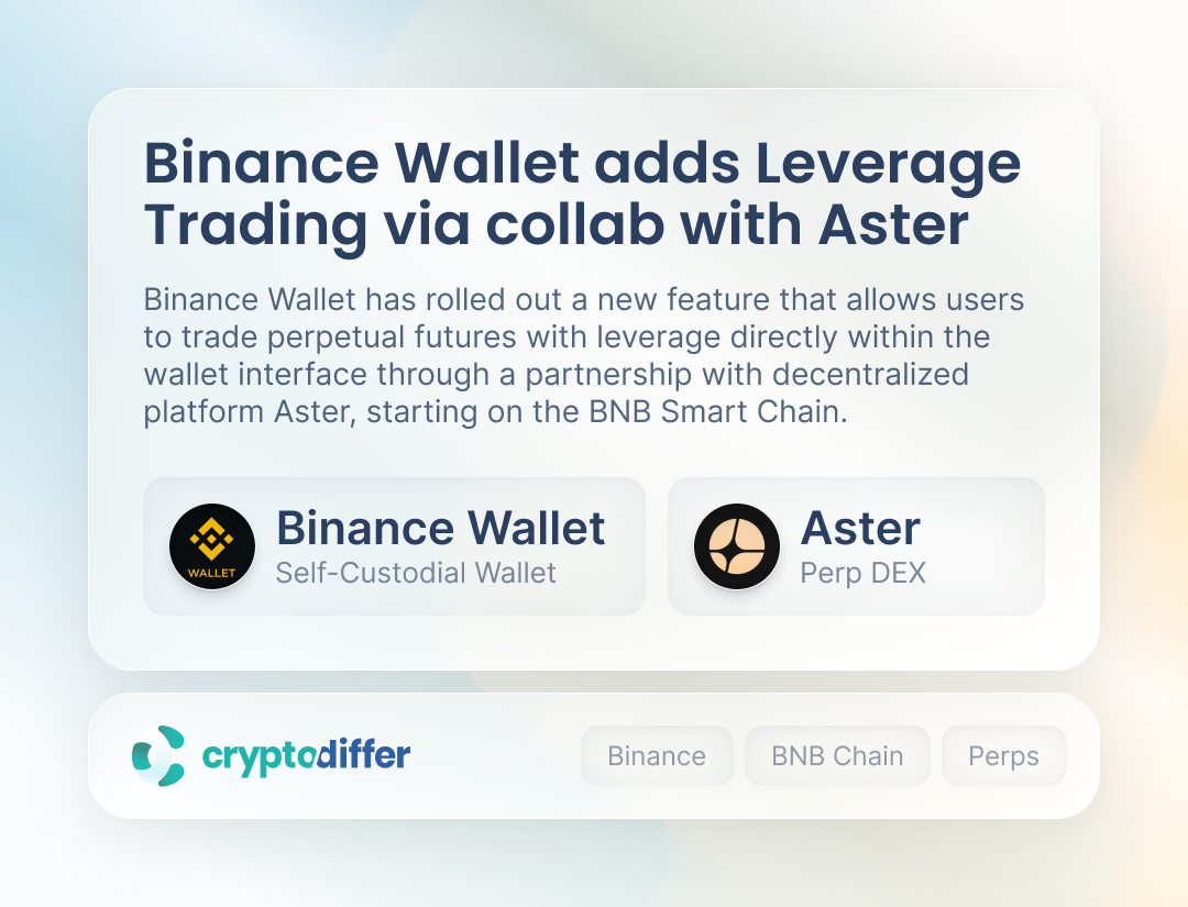Binance Wallet has rolled out a new feature that allows users to trade perpetual futures with leverage directly within the wallet interface through a partnership with decentralized platform Aster, starting on the BNB Smart Chain.