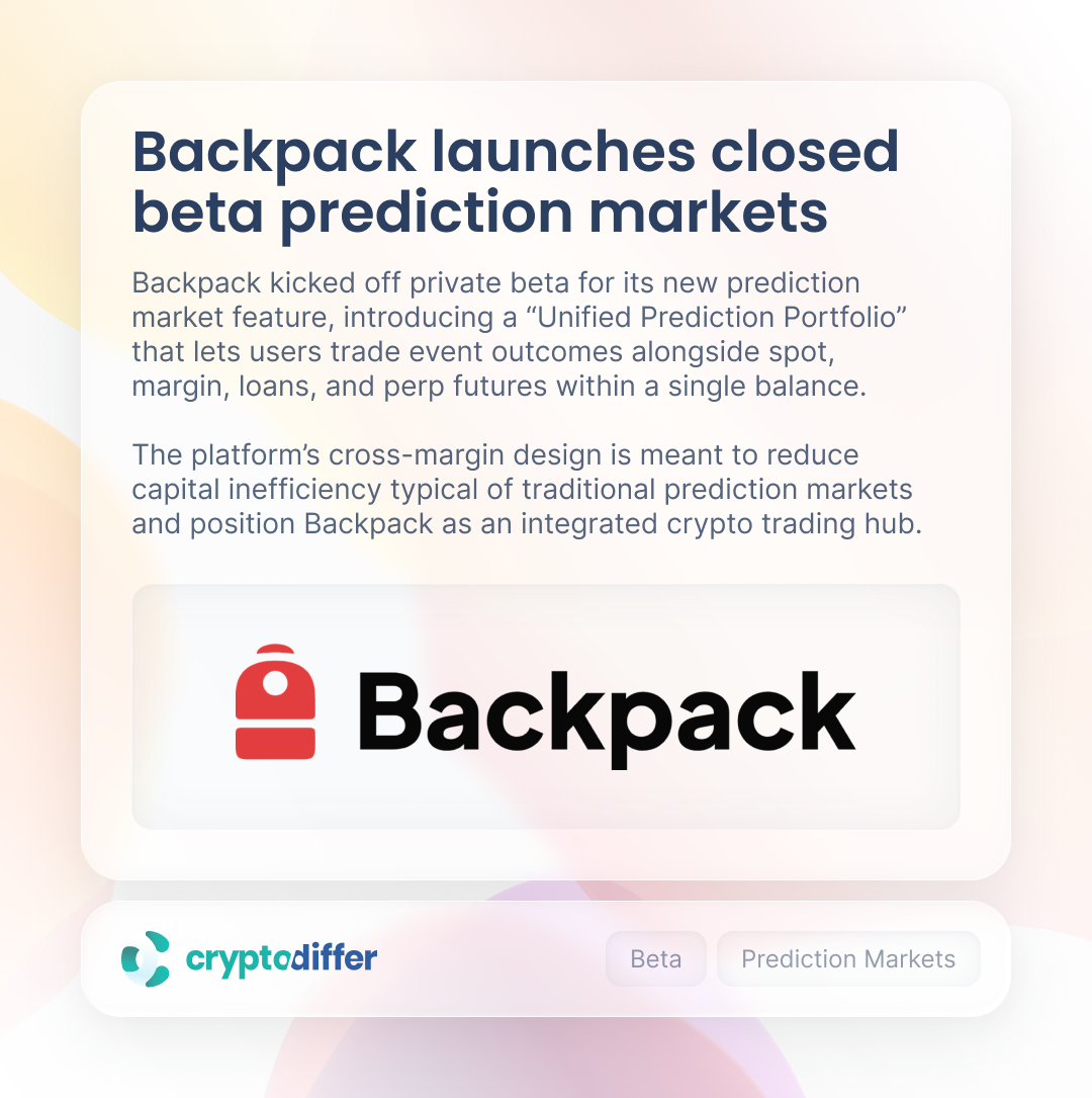 Backpack kicked off private beta for its new prediction market feature, introducing a βUnified Prediction Portfolioβ that lets users trade event outcomes alongside spot, margin, loans, and perp futures within a single balance.