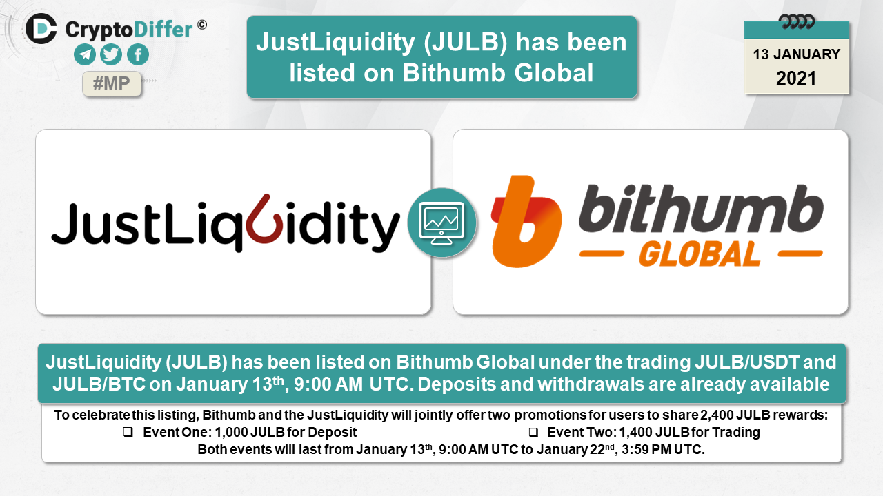 JustLiquidity (JULB) has been listed on Bithumb Global under the trading JULB/USDT and JULB/BTC on January 13th, 9:00 AM UTC. Deposits and withdrawals are already available.
