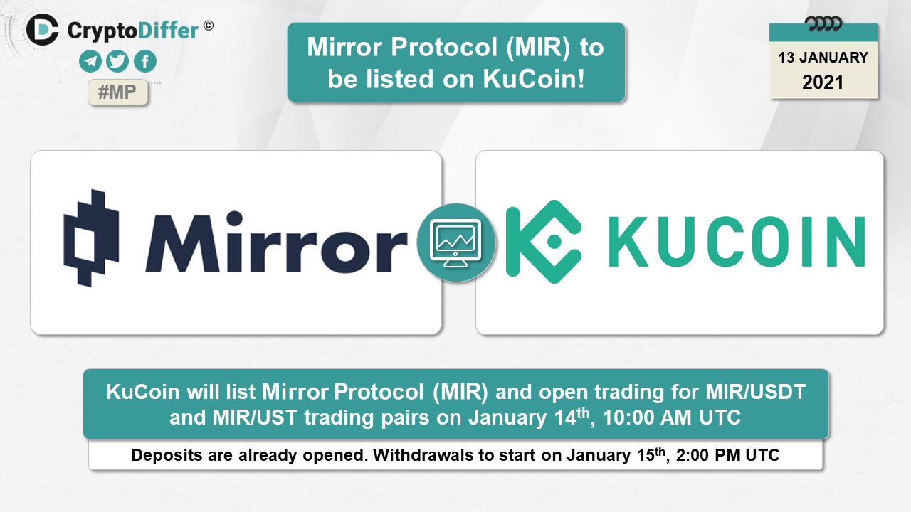 KuCoin will list Mirror Protocol (MIR) and open trading for MIR/USDT and MIR/UST trading pairs on January 14th, 10:00 AM UTC. Deposits are already opened. Withdrawals to start on January 15th, 2:00 PM UTC.