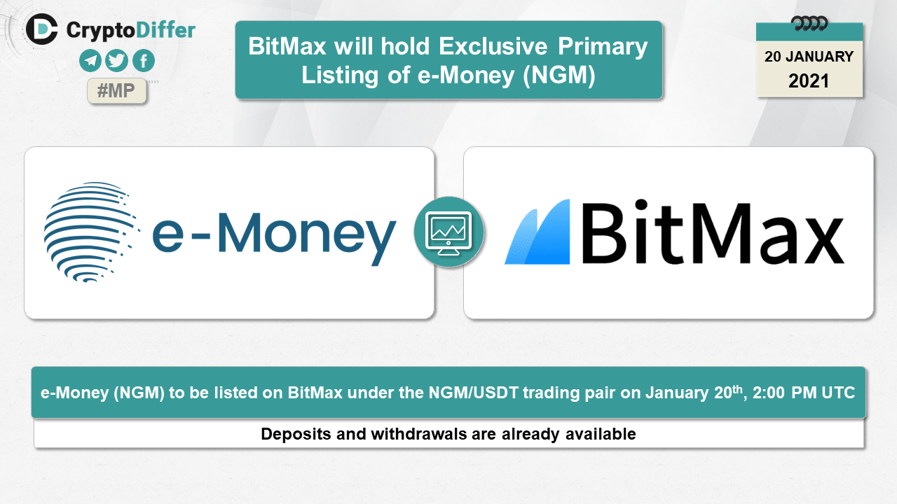 e-Money (NGM) to be listed on BitMax under the NGM/USDT trading pair on January 20th, 2:00 PM UTC. Deposits and withdrawals are already available.
