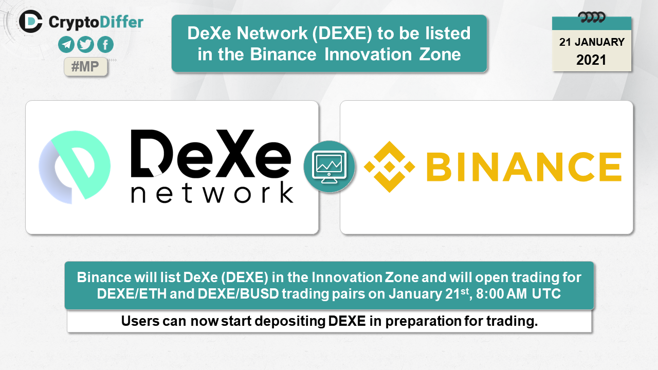 Binance has listed DeXe (DEXE) in the Innovation Zone and opened trading for DEXE/ETH and DEXE/BUSD trading pairs on January 21st, 8:00 AM UTC. Users can now start depositing DEXE in preparation for trading.