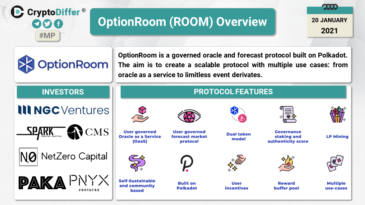 OptionRoom is a governed oracle and forecast protocol built on Polkadot. The aim is to create a scalable protocol with multiple use cases: from oracle as a service to limitless event derivates.
