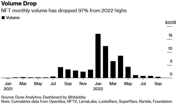 😐 Объёмы торгов NFT падают уже пятый месяц подряд