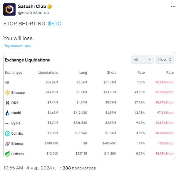 🫢 "Прекратите. Шортить. Биткоин! Вы потеряете деньги" — пишет Satoshi Club на фоне статистики ликвидаций на биржах