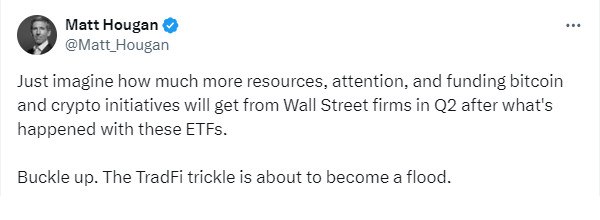 "Только представьте, насколько больше ресурсов, внимания и финансирования инициатив в области биткоина и криптовалют придет от фирм с Уолл-стрит во втором квартале после того, что произошло с ETF.