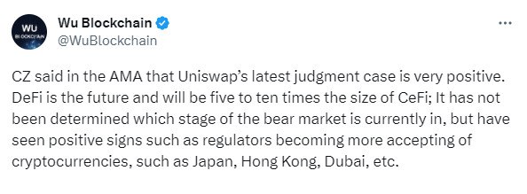 🗣 CZ заявил на AMA-сессии, что последнее судебное решение по Uniswap является очень позитивным. DeFi — это будущее, и этот сектор будет в пять-десять раз больше CeFi. Пока трудно сказать, на какой стадии медвежьего рынка мы находимся сейчас, но наблюдаются положительные признаки (например, регулирующие органы Японии, Гонконга, Дубая становятся более лояльными к криптовалютам)