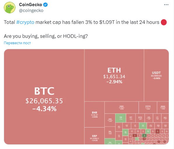 🩸Общая рыночная капитализация крипторынка за последние 24 часа упала на 3% до $1,09 трлн.