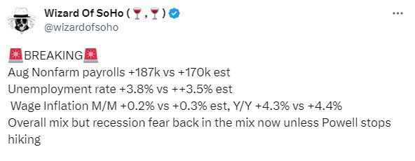 🚨 Число рабочих мест в несельскохозяйственном секторе в августе +187 тыс. (против +170 тыс. ожидания)
