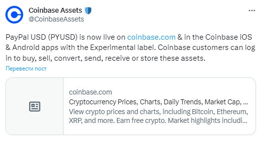 🗓 Биржа Coinbase залистила стейблкоин PYUSD от PayPal