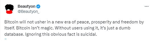 "Биткоин сам по себе не откроет новую эру мира, процветания и свободы. Биткоин — это не волшебство. Без пользователей, использующих его, это просто тупая база данных. Игнорировать этот очевидный факт — самоубийство"