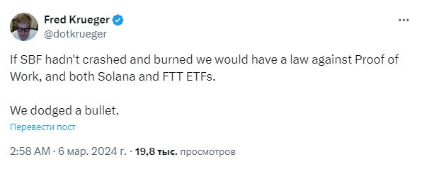 "Если бы SBF не рухнул и не сгорел, у нас сейчас был бы закон против Proof-of-Work, а также ETF на Solana и FTT.