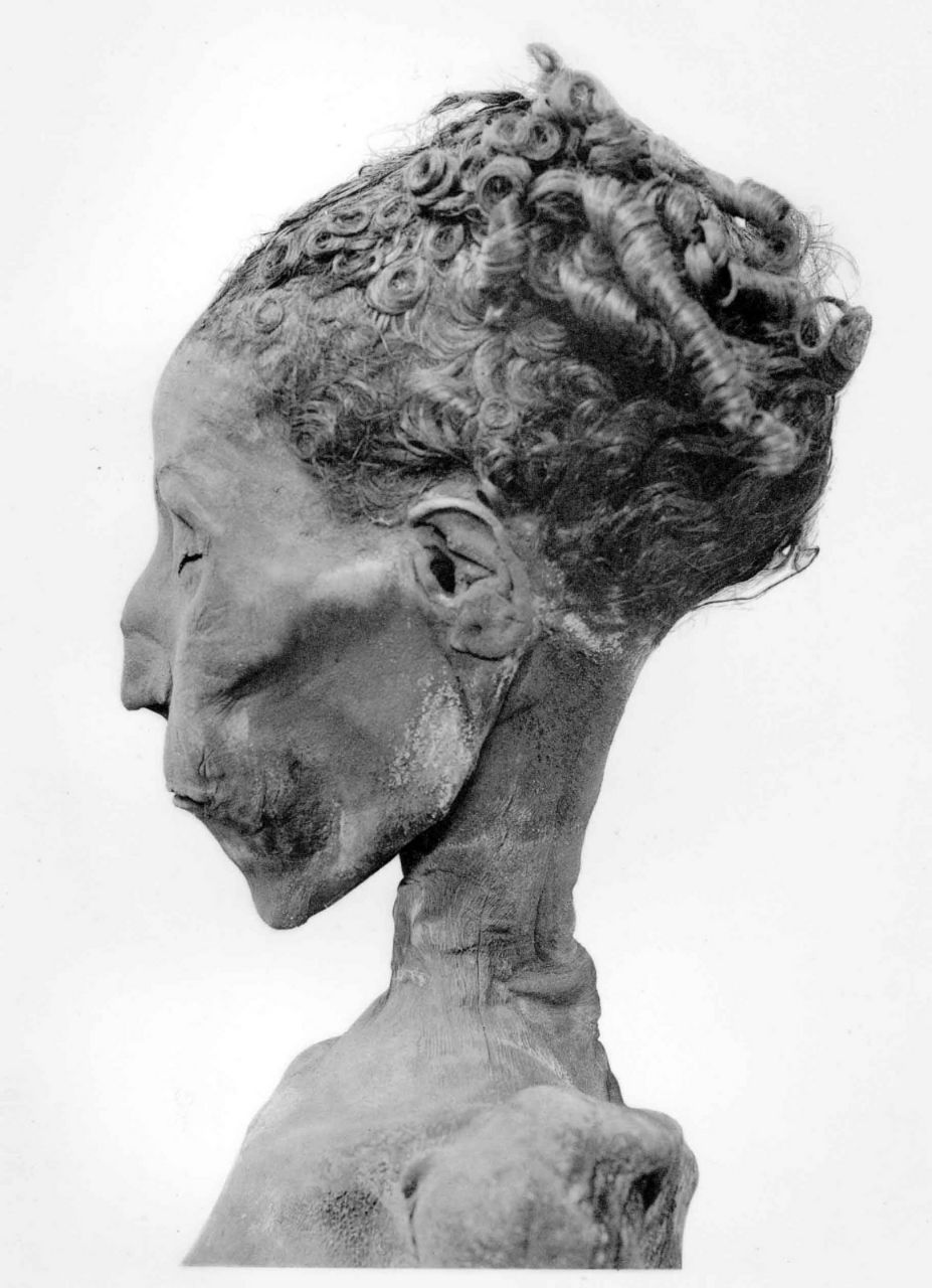 На фото ниже - ещё одна мертвая царица с расплющенным носом. Бабушка #Тутанхамона по имени Тэйе. (18 династия). 👇