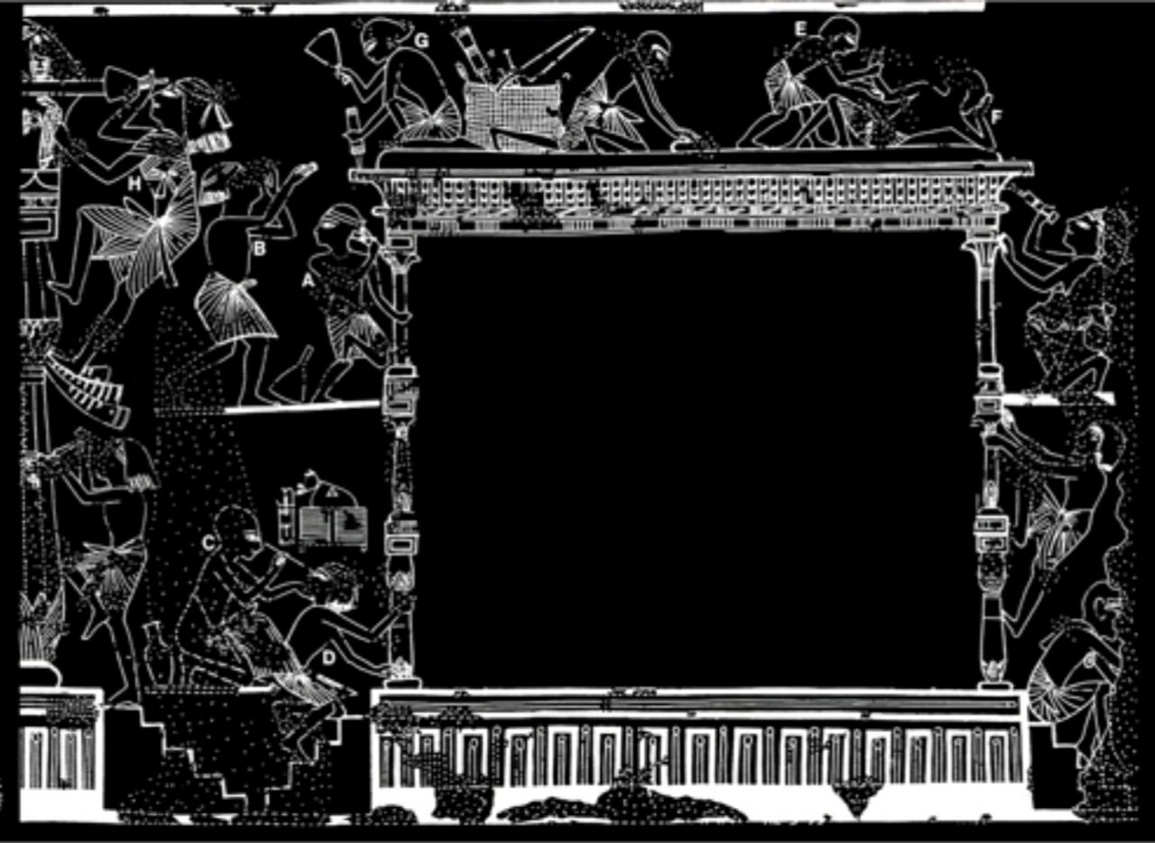 Это прорисовка росписи из гробницы царского художника #Ипуи (13 век до твоей эры). Парень был не только талантливый, но и с юмором.