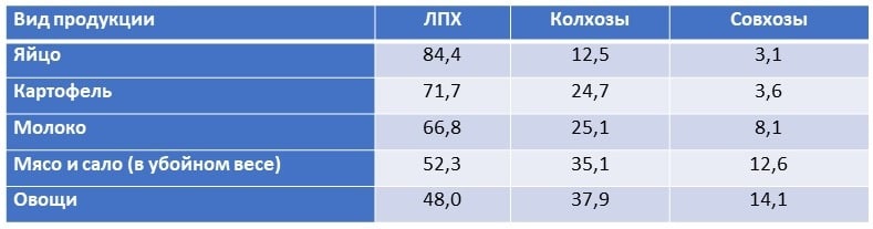 В результате к середине 1950-х личные приусадебные хозяйства по ключевым продовольственным позициям обеспечивают их основную долю в общей структуре сельскохозяйственного производства страны.