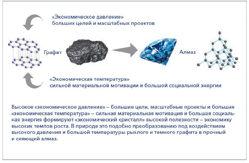 Целенаправленно организована экономическая система – кристаллизован «экономический бриллиант» с высокими полезными свойствами – с высоким ростом экономики. То есть в природе это похоже на процесс кристаллизации алмаза из графита, который идет при сообщении большого количества энергии – при высоких давлении и температуре. Температура вещества обусловлена высокой кинетической энергией атомов. В этом случае рыхлый и темный графит преобразуется в прочный и сияющий алмаз.