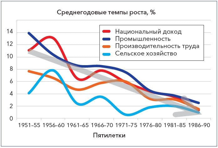 Система государственного управления переходит в режим «затухающей» работы. Больших целей не ставится – планируют от достигнутого, структурные изменения экономики при таком планировании не происходят, масштабные проекты практически не реализуют. Материальные стимулы роста эффективности разрушены.