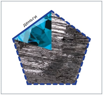 Ликвидация системы планирования «выбивает» центральный элемент структурной части алмаза, превращая его в графит. Ликвидация остальных элементов системы продолжает разрушение иерархичной кристаллической решетки. В результате драгоценный бриллиант превращается в графит, а затем в кучку золы (см. рисунок).