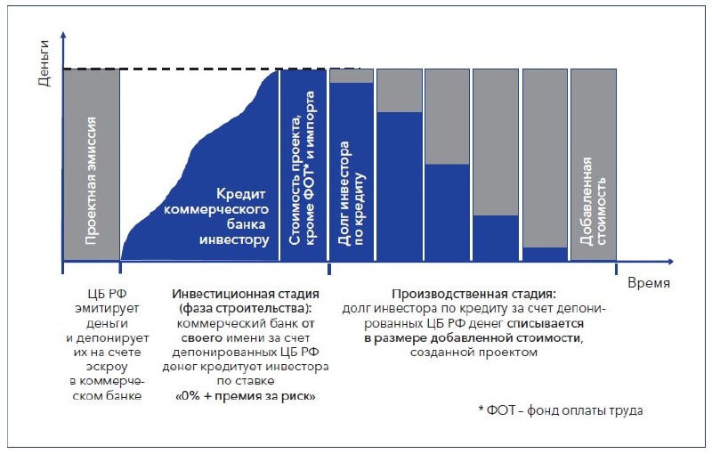 Таким образом, в предлагаемом механизме целевого проектного финансирования дополнительные деньги попадают в экономику строго через инвестиции и производство новых товаров и создание новой добавленной стоимости, что способствует снижению инфляции. Банк при этом механизме замотивирован финансировать реальный сектор, искать и помогать создавать новые проекты, контролировать их реализацию, максимально содействовать успешной реализации – запуску новых производств.