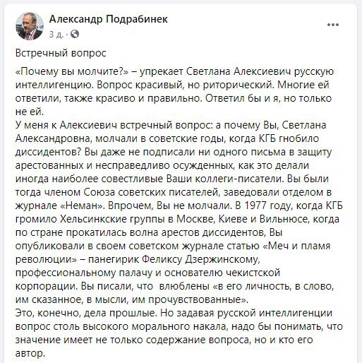На письмо Светланы Александровны Алексиевич к «русской интеллигенции» отвечает Александр Пинхосович Подрабинек, автор диссидент-хита 1979 года «Карательная медицина» и борец за права чебуречной «Антисоветская».