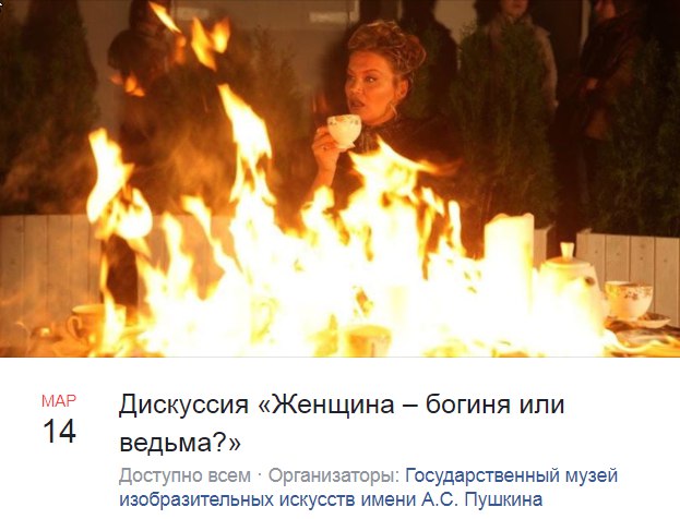 Продолжаем следить за похождениями Дарьи Серенко, директора галереи «Пересветов переулок» (Депкульт). Сегодня Серенко и еще пятеро левых активистов и феминисток обсуждают тему «Женщина — богиня или ведьма?». В ГМИИ им. Пушкина! Судя по официальной странице — дискуссия сопровождается некими мрачными обрядами.