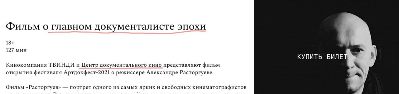 Расторгуев до своей (бесспорно трагической) гибели был известен чернушными документалками, протестной деятельностью (даже фильм снял про Болотную), любовью к пост-майданной Украине. Вдове (она же режиссер фильма “Расторгуев”) - по-человечески сочувствуем. Но участие московского госучреждения в раскрутке данного персонажа как «главного документалиста эпохи» и его наследия - это как назвать? Диверсия? Идиотизм?