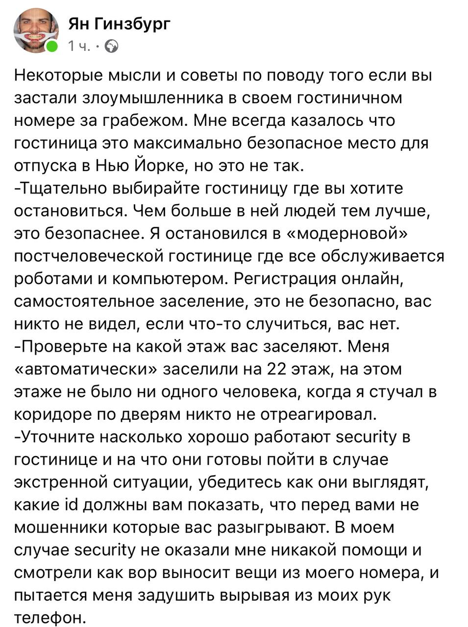 Некоторые мысли и советы по поводу того если вы застали злоумышленника в своем гостиничном номере за грабежом. Мне всегда казалось что гостиница это максимально безопасное место для отпуска в Нью Йорке, но это не так.