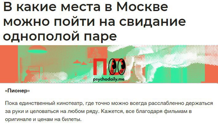 Оказывается, к/т “Пионер” уже попал в подборку лучших ЛГБТ-френдли мест в Москве. Александр Леонидович, вопросов к Вам больше не имеем!
