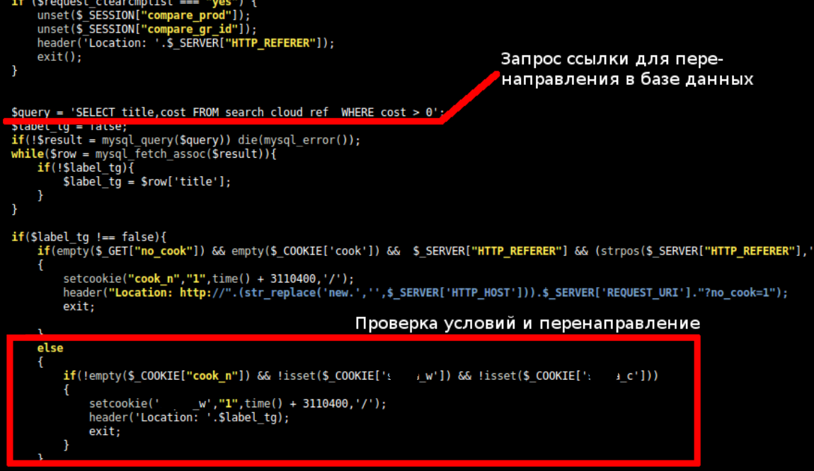 Скриншот, который вы увидите в конце поста, мы сделали некоторое время назад в недрах сайта одного крупного онлайн-ритейлера (простите, это PHP). Смысл кода в следующем: из базы данных выбирается поле "title", вопреки названию, содержащее url. Дальше происходит проверка, что посетитель на сайте впервые (не установлены cookie от сайта) и что он пришел из поисковой системы. И дальше — безусловный редирект по полученному ранее url.