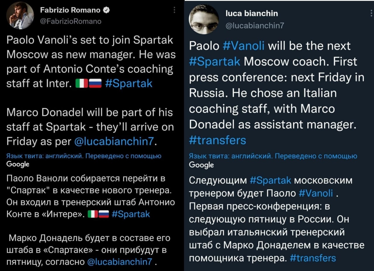 Различные итальянские инсайдеры: Николо Шира, Фабрицио Романо, а также журналист La Gazzetta dello Sport Лука Бьянчин сообщают о назначении Паоло Ваноли в «Спартак», как о свершившимся факте.