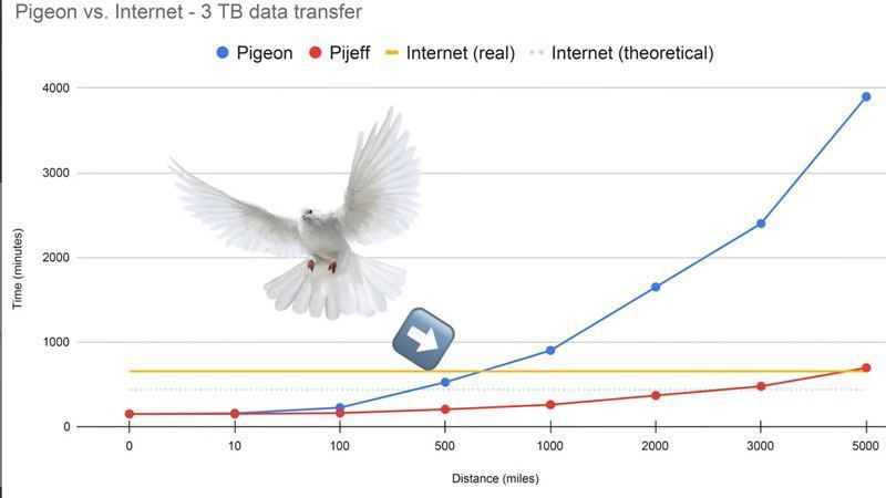 Птице удалось преодолеть это расстояние примерно за минуту. К этому результату Джефф прибавил время, необходимое на локальный перенос файлов. По итогу весь процесс занял меньше времени, чем скачивание такого объема данных по интернету.