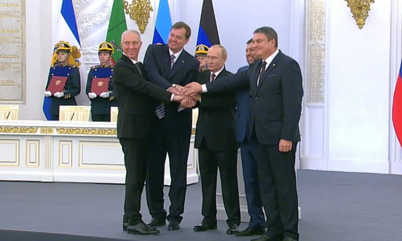 Главы ДНР и ЛНР Денис Пушилин и Леонид Пасечник, а также руководители военно-гражданских администраций (ВГА) Запорожской и Херсонской областей Владимир Сальдо и Евгений Балицкий и Владимир Путин уже подписали договор о принятии в РФ четырех новых субъектов.