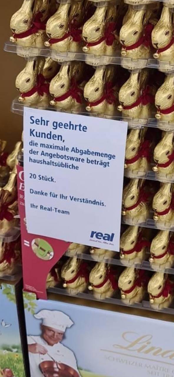 Сегодня в Германии празднуют Пасху (Ostern). Одним из обязательных атрибутов праздника является пасхальный зайчик (Osterhase). Немцы тщательно готовятся к этому празднику и делают запасы. Моя подруга из Фрайбурга прислала мне фотографию, которой я спешу поделиться с вами.