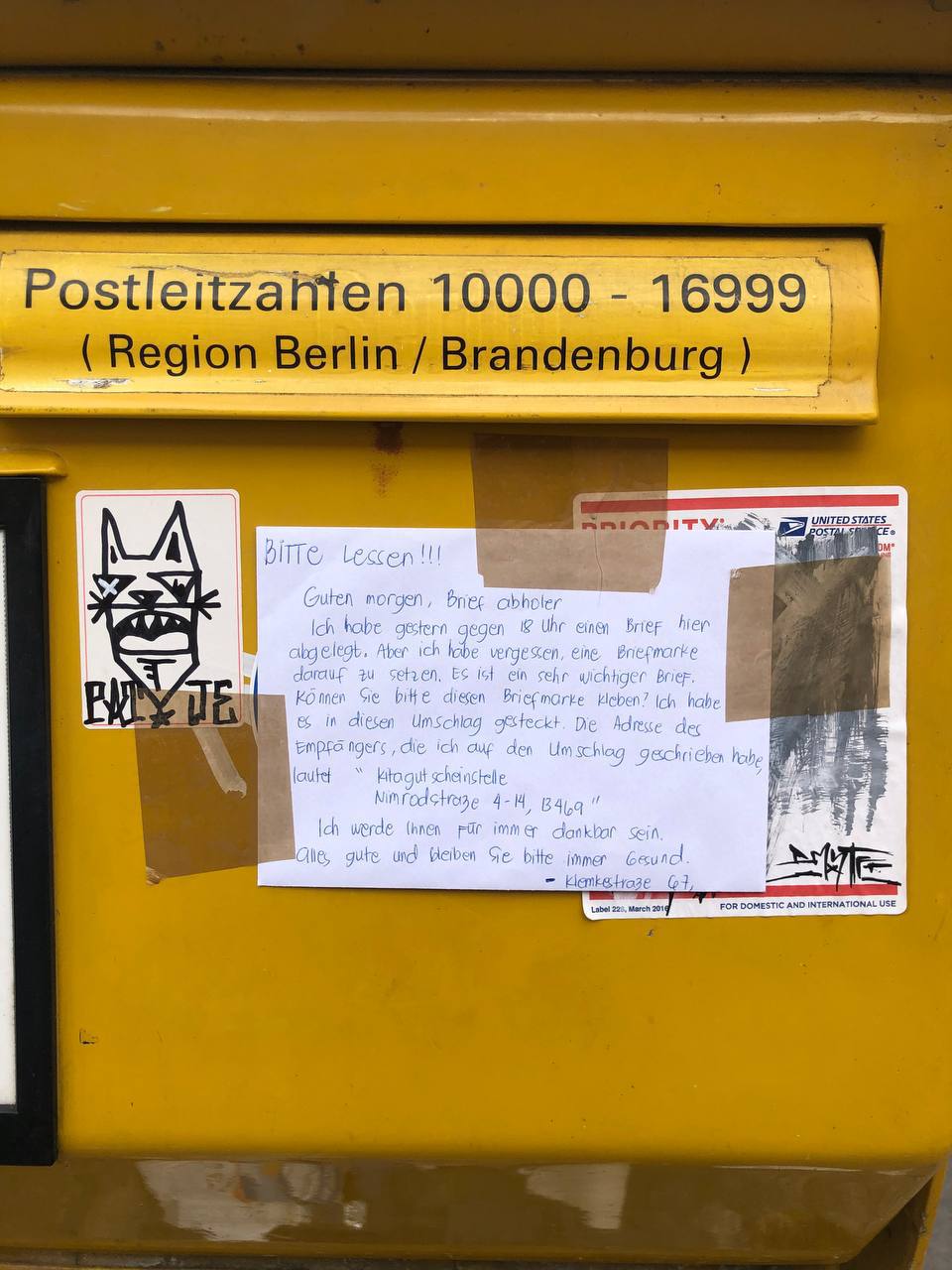 Рубрика #brieffreunde набирает обороты. Сегодня разберём записку, которую наша читательница обнаружила на почтовом ящике. В ней неизвестный просит почтальона приклеить марку, которую отправитель забыл налепить на очень важное письмо.