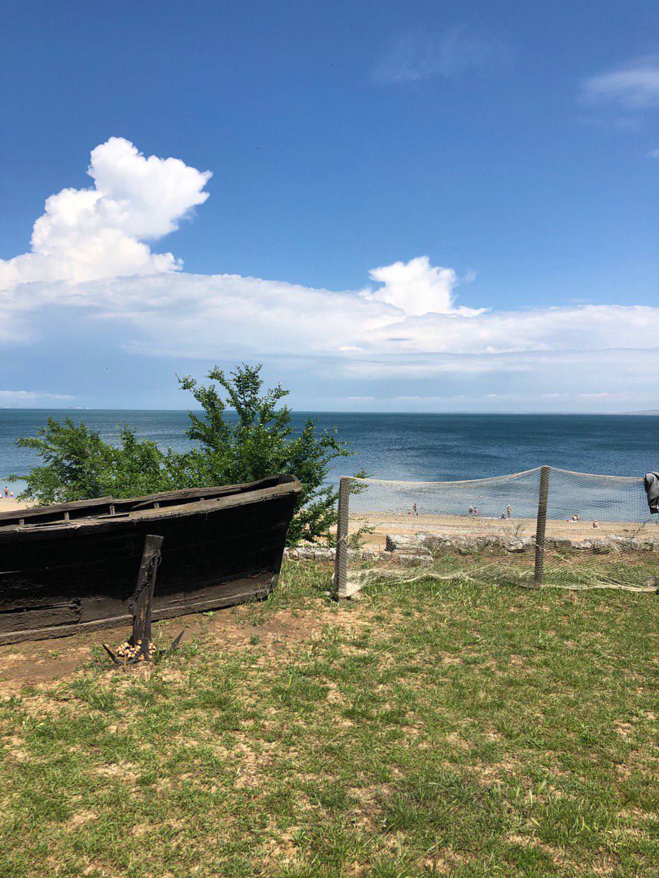 Es gibt hier drei Boote. Sie heißen Anna, Veronika und Maria. Daneben liegen die Touristen in der Sonne.