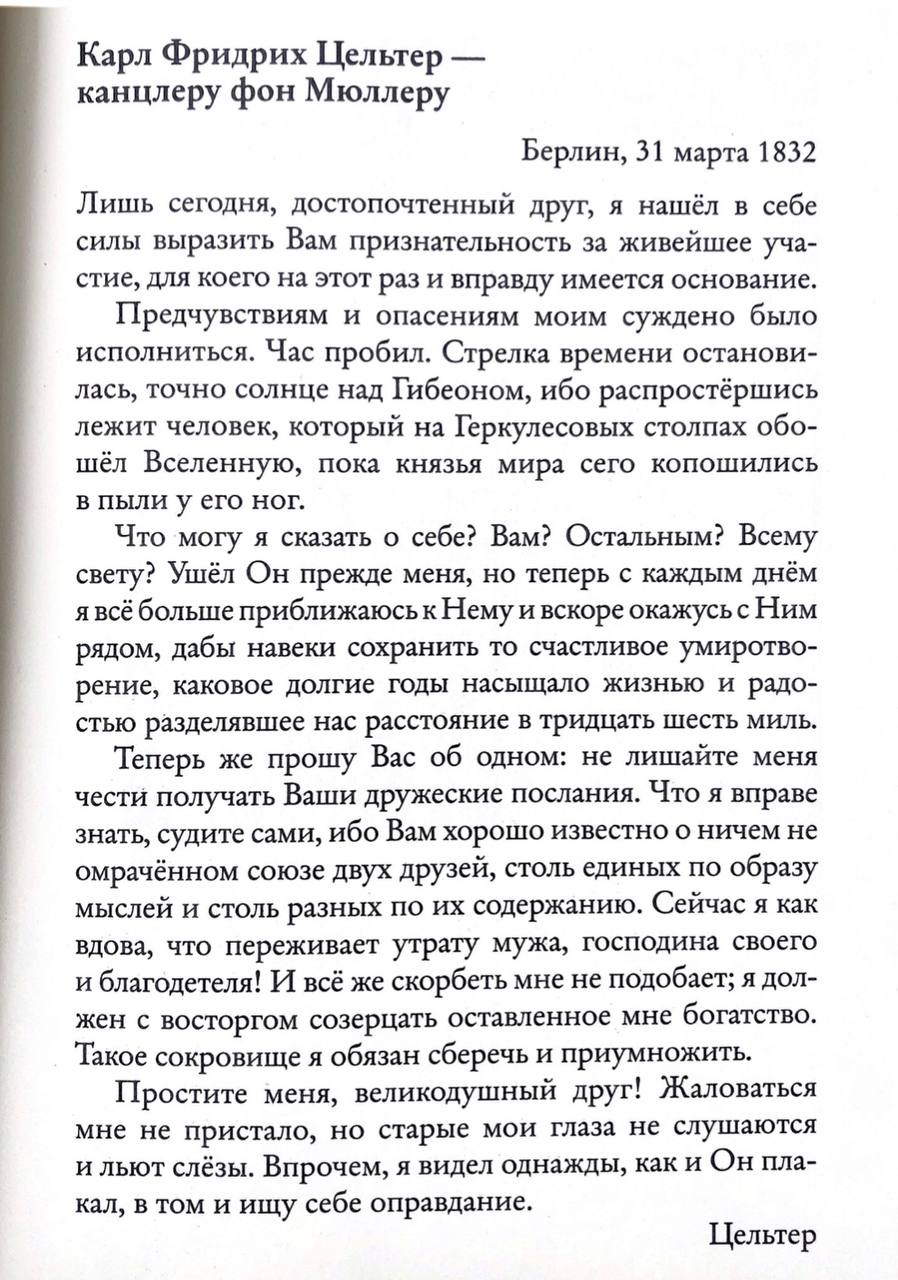 Первое письмо в книге датируется 31 марта 1832 года. Всего несколько дней назад умер Гёте. Композитор и музыкальный педагог Карл Фридрих Цельтер пишет о своих переживаниях смерти поэта в письме канцлеру Великого герцогства Саксен-Веймар-Эйзенахского фон Мюллеру. В этом письме читается глубокая скорбь об утрате не просто видной личности, а чего-то большего и общего.