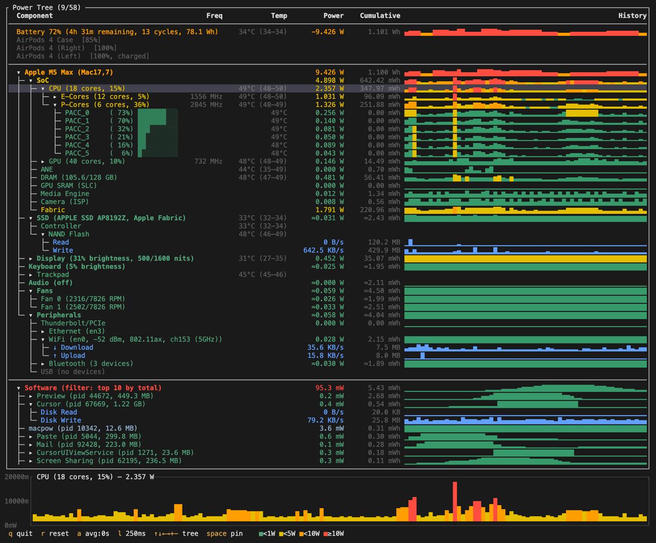686) is a real-time power tree TUI for Apple Silicon. macpow reads directly from macOS hardware interfaces β IOReport, SMC, IORegistry, CoreAudio, and Mach/kernel APIs β to show per-component power draw, temperatures, frequencies, CPU utilization, and per-process energy attribution. No sudo required.