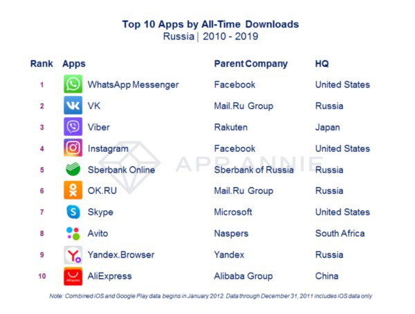 По данным App Annie мессенджер WhatsApp стал самым скачиваемым приложением с 2010 по 2019 годы в России. На втором месте по количеству загрузок в России приложение «ВКонтакте», на третьем — мессенджер Viber.
