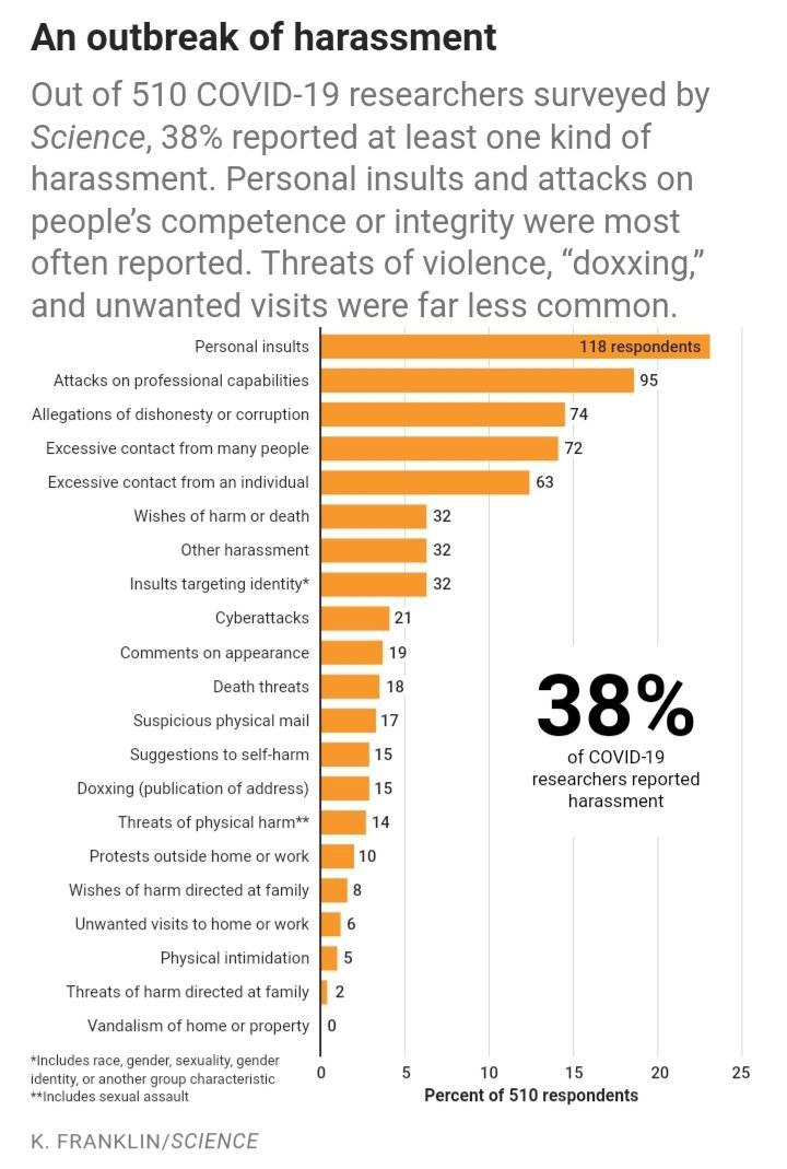 Журнал Science опубликовал интересные результаты опроса исследователей-вирусологов, работавших с COVID-19. Оказывается, 38% из опрошенных 510 человек во время пандемии сталкивались с угрозами: "доксингом" (сливом личных данных), обвинениями в связях с международным кагалом сатанистов-педофилов (да, отметился QAnon) и другими ее видами.