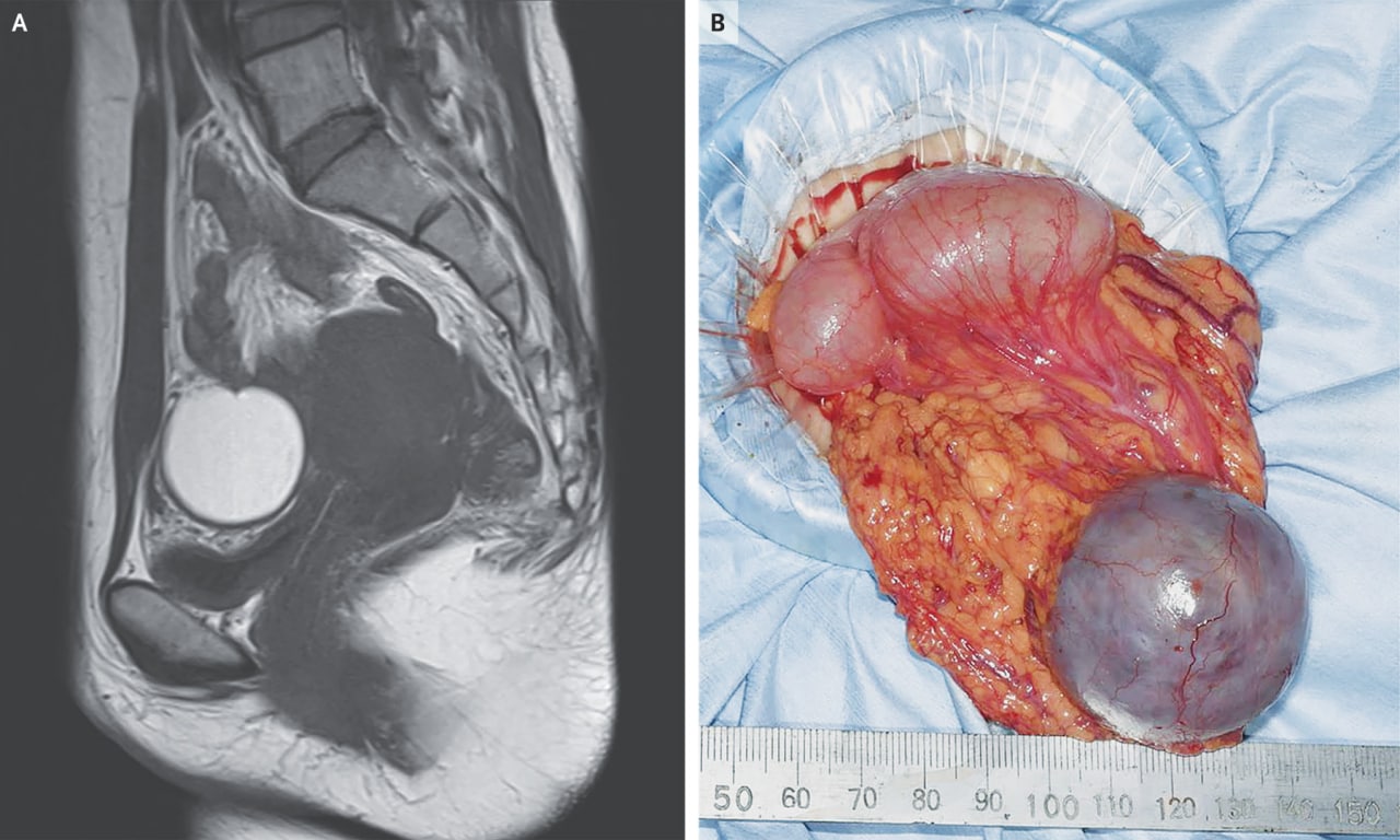 Магнитно-резонансная томография выявила кистозную массу размером 4,1 см на 4,1 см на 4,1 см в нижней части живота, которая имела высокую интенсивность сигнала на Т1-взвешенном изображении (фото A). При выполнении лапароскопии (разрез брюшной полости) хирурги обнаружили, что образование имеет сальниковое происхождение (фото B; также видны петли кишечника). Матка и яичники задеты не были, образование удалили.