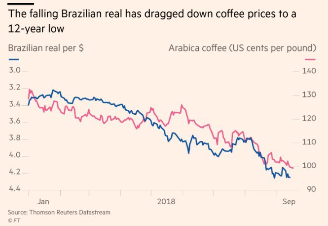 Кофе и стоимость бразильского реала всегда были тесно связаны между собой. Падение бразильской валюты стимулирует фермеров продавать больше кофе на экспорт для увеличения прибыли. К тому же, производители кофе в Бразилии в этом году собрали рекордный урожай, заметно расширив предложение товара на международных рынках. Доля Бразилии на рынке производителей кофе >32%.