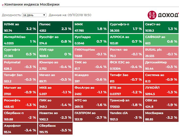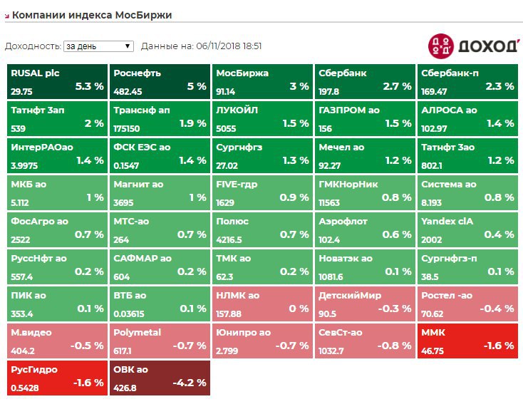 Российский рынок показал рост по итогам торгов во вторник. Индекс МосБиржи вырос на 1,44%. В лидерах сегодня оказались акции Русала, Роснефти и КТК после публикации финансовых результатов. Слабее рынка сегодня выглядят металлурги. https://dohod.ru/ik/analytics/stockmap/