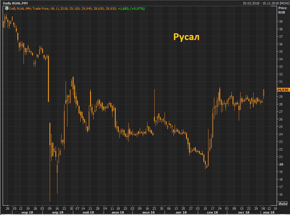 Русал сегодня в лидерах роста на Московской бирже. Акции прибавляют более 6% после публикации отчётности. EBITDA за 3 квартал 2018 года увеличилась на 23,1% в годовом выражении, чистая прибыль на 91% (в $).