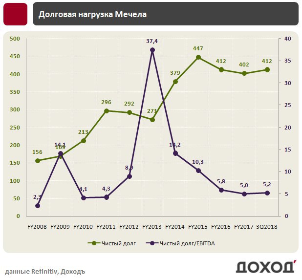 Совокупный долг Мечела составляет 416 млрд. рублей. Свободный денежный поток компании за последние 12 мес составил 65,1 млрд. руб, из которых 41,2 млрд ушло на выплату процентов, 20 млрд. на погашение долга.