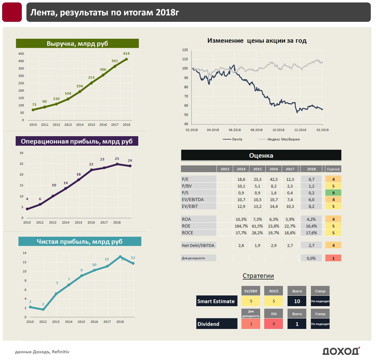 Третий ритейлер России по объему продаж Лента отчитался о росте выручки на 13,2% в годовом выражении по итогам 2018 года до 413,6 млрд руб. Это стало слабейшим результатом в современной истории компании. Операционная прибыль ритейлера упала на 5,8% до 24,1 млрд. руб, чистая прибыль снизилась на 11,1% до 11,8 млрд руб.