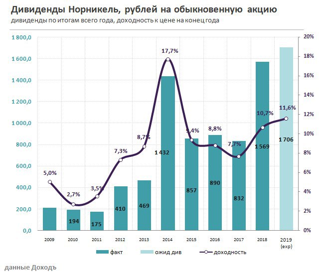 Норникель рекомендовал дивиденды в 60% от EBITDA за 2 полугодие, как и предусматривает акционерное соглашение. Доходность выплат 5,4%. Акции на прошлой неделе обновили исторический максимум. Конъюнктура цен на цветные металлы должна позволить компании сохранить выплаты не ниже текущего уровня по итогам 2019 года.