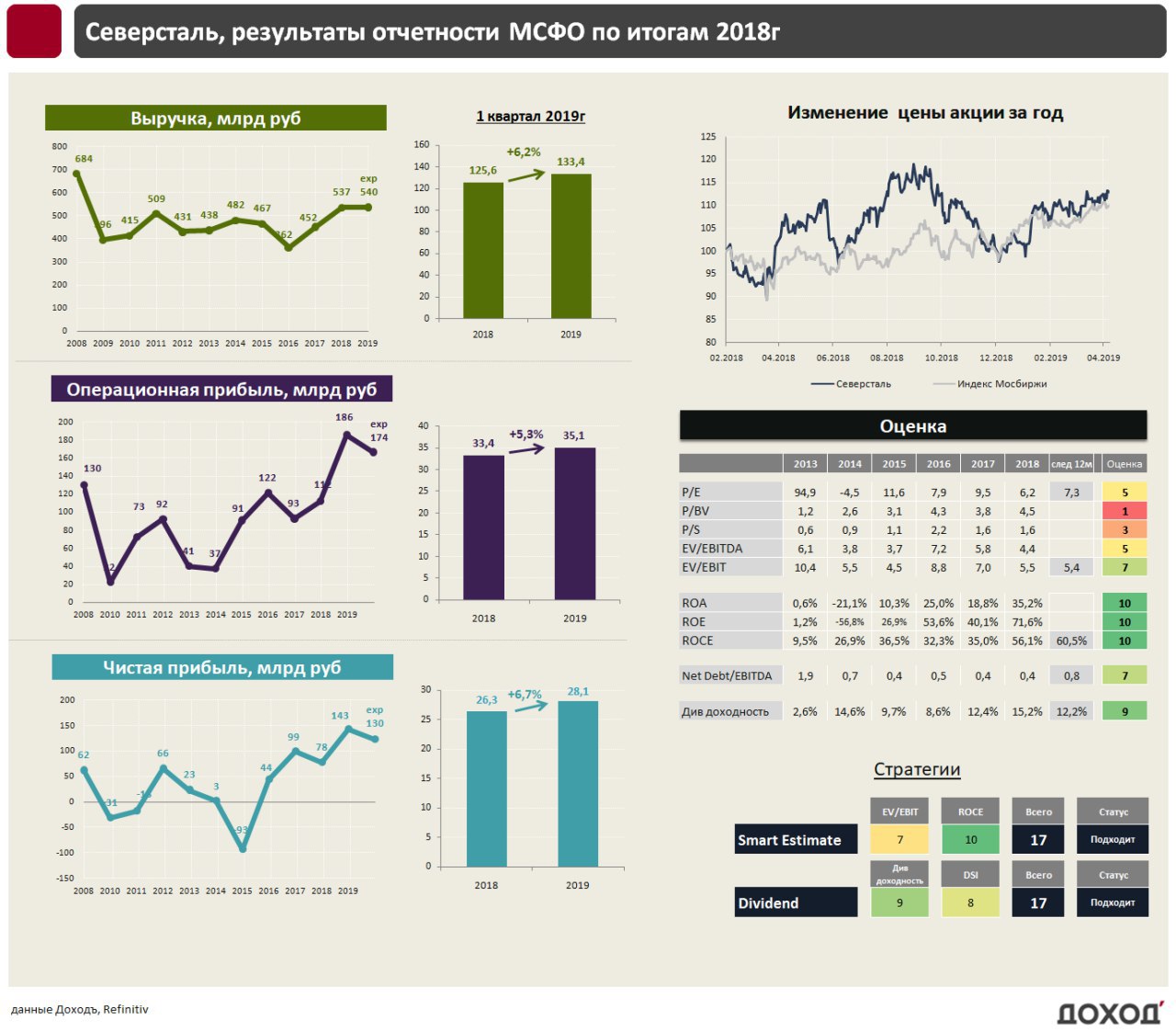 🔹 Перед началом нового инвестиционного цикла Северсталь ухудшила результаты по итогам 1 квартала в долларах из-за снижения цен на сталь. Снижение стоимости рубля позволило увеличить выручку и прибыль в рублевом выражении.