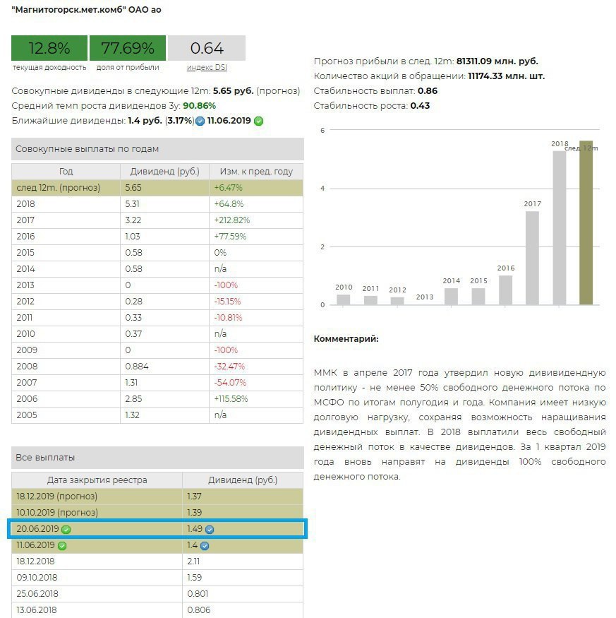 Совет директоров ММК рекомендовал дивиденды за 1 квартал 2019 года в размере 1,488 рублей на акцию. Дивидендная доходность к текущим ценам составляет 3,4%. Дата закрытия реестра: 20 июня 2019 года.